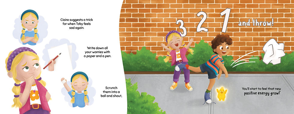 I have two. 1. The art room and the handwritten note. This is the turning point in the book for Toby, and I think flows really nicely, I also love Echo in it holding up the paper chain of itself. The second favourite is the 3,2,1 and throw page. This page too a bit of tweaking and back and forth corresponding. It took feedback from my sister, and my husbands input to master what we were all aiming for. This page to me represent teamwork, and I love that the page is promoting supporting one another and having positive energy.